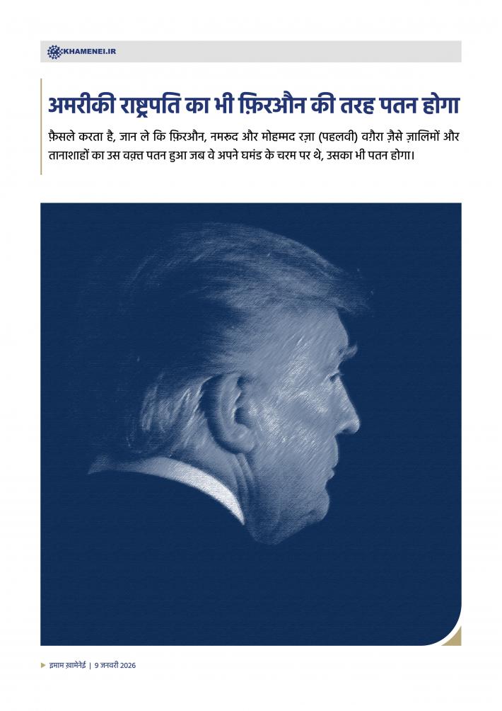 फ़ैसले करता है, जान ले कि फ़िरऔन, नमरूद और मोहम्मद रज़ा (पहलवी) वग़ैरा ज़ैसे ज़ालिमों और तानाशाहों का उस वक़्त पतन हुआ जब वे अपने घमंड के चरम पर थे, उसका भी पतन होगा। इमाम ख़ामेनेई 9 जनवरी 2026