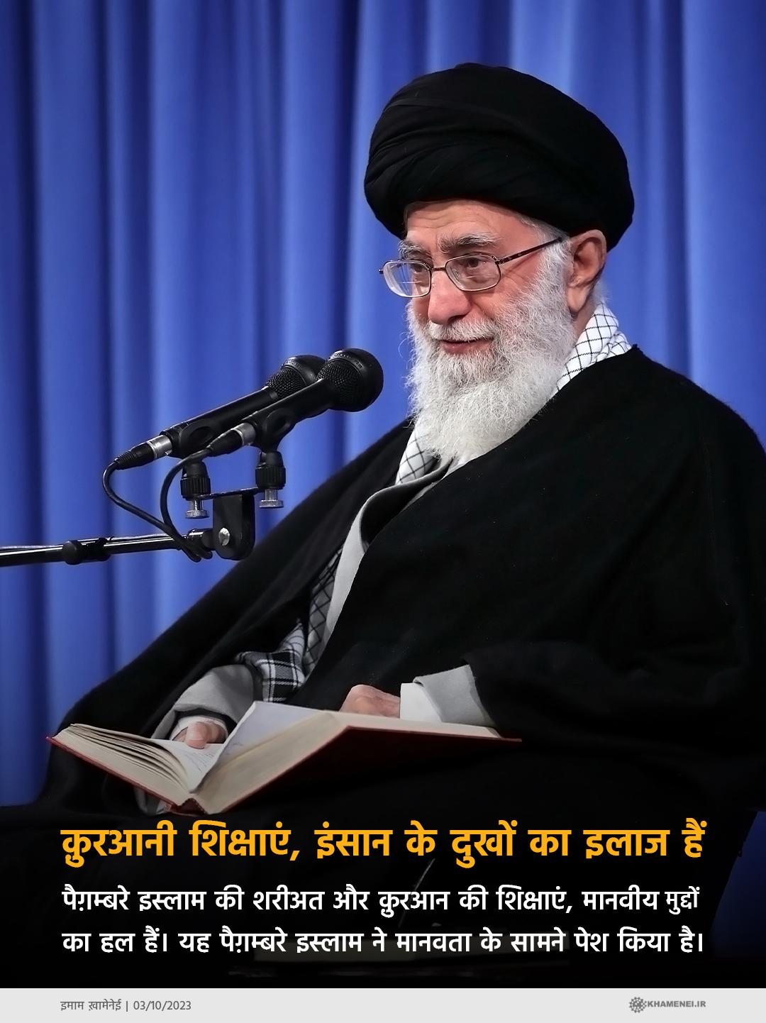 अल्लाह फ़रमाता हैः "यह एक किताब है जो हमने आप पर इसलिए नाज़िल की है कि आप लोगों को उनके परवरदिगार के हुक्म से (कुफ़्र की) तारीकियों से निकाल कर (ईमान की) रौशनी की तरफ़ लाएं" (सूरए इब्राहीम, आयत-1) हमने आप पर यह किताब नाज़िल की है कि इंसानों को आप अंधकार से निकाल कर रौशनी तक पहुंचा दें। अंधकार क्या है? अंधकार में वो सभी चीज़ें आती हैं जिनसे पूरे इतिहास में इंसान की ज़िन्दगी कड़ुवाहट से भर गयी, ज़हरीली हो गयी। ये सब अंधकार हैं। जेहालत, यानी अंधकार, ग़रीबी यानी अंधकार, ज़ुल्म यानी अंधकार, भेदभावपूर्ण रवैया अंधकार है, इच्छाओं का ग़ुलाम हो जाना अंधकार है, अख़लाक़ी बुराइयां और सामाजिक ऐब ये सब अंधकार हैं। पैग़म्बरे इस्लाम सल्लल लाहो अलैहि वआलेही वसल्लम ने इन सभी मुद्दों का हल, वैचारिच हल और व्यवहारिक हल भी मानवता के सामने पेश किया है। अगर इन मुद्दों से छुटकारा पाना चाहते हो तो इलाज यह है। पैग़म्बरे इस्लाम की शरीअत और क़ुरआन की शिक्षाएं, मानवीय मुद्दो का हल हैं। यह पैग़म्बरे इस्लाम ने मानवता के सामने पेश किया है।